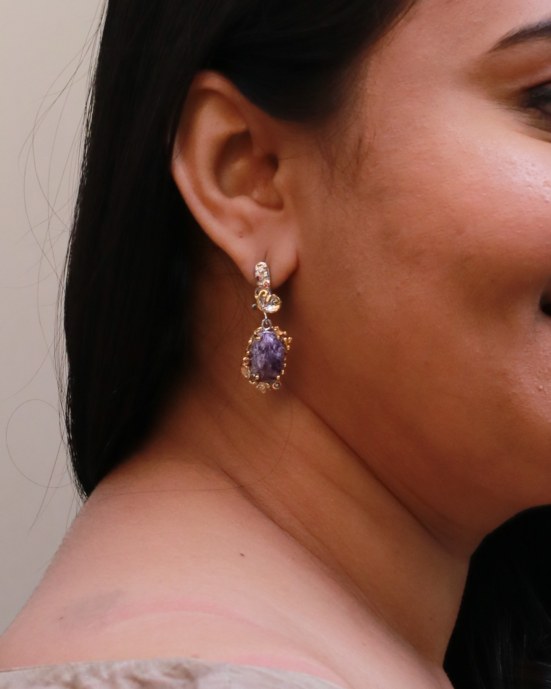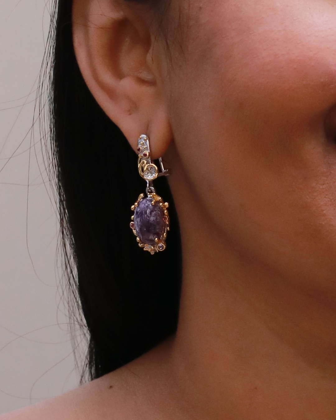 LAVENDRA, a rich purple hue of Charoite t in combination with Tanzanite and other gemstones make it stand apart. Coral like structure represents the depths of beauty of the Oceans.