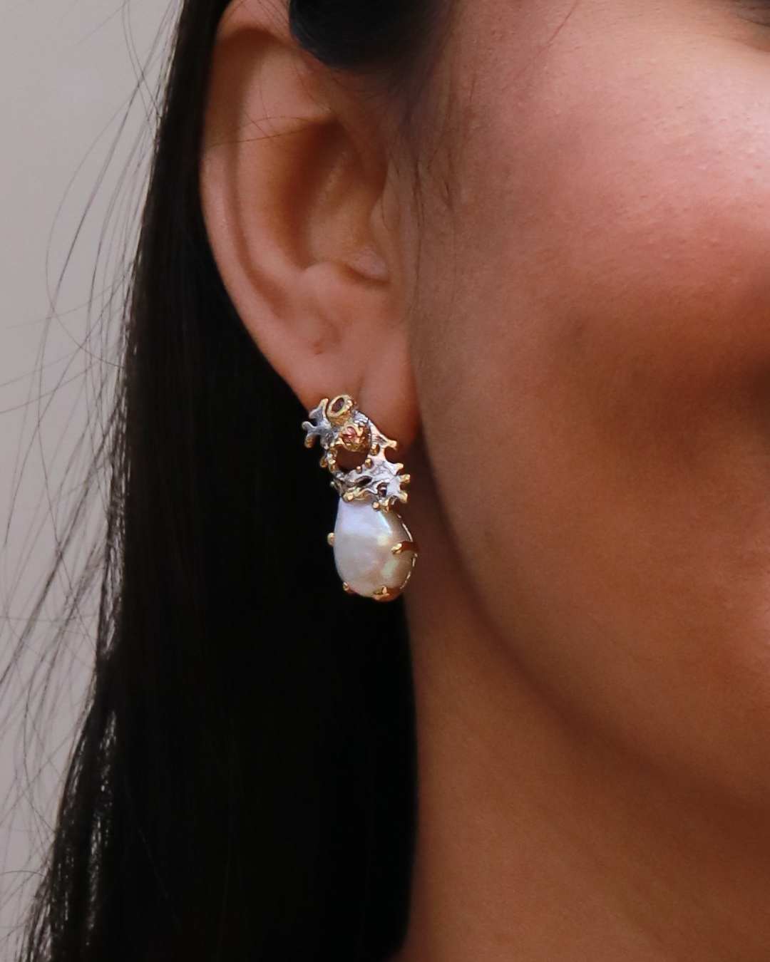 MARVELLA, Freshwater Keshi Pearls in combination with Orange Sapphire and other gemstones make it stand apart. Coral like structure represents the depths of beauty of the Oceans.