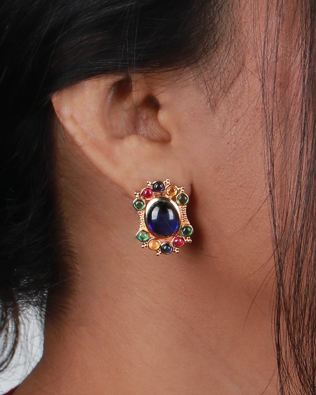NEEL Earrings, a unique design with centre piece as an oval LABGROWN BLUE SAPPHIRE surrounded by other semi precious gemstones in 92.5 Silver is a game changer.