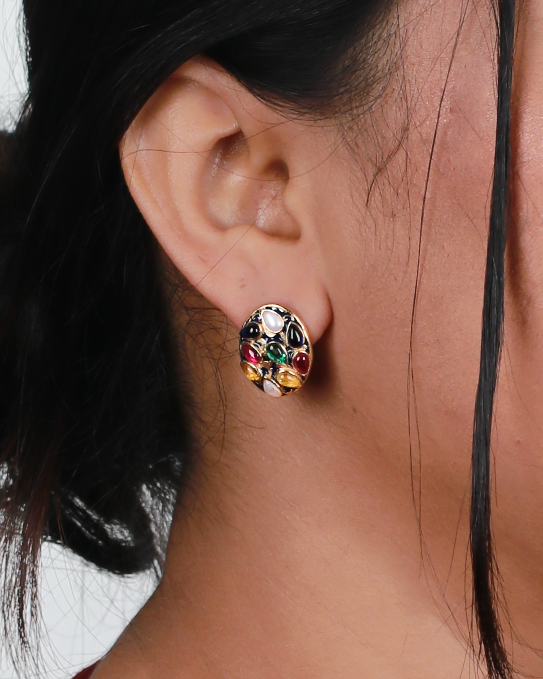 NOOR Earrings, a classic oval base with tear shaped gemstones cast on it bezelled with background enamelling in 92.5 Silver is a game changer.